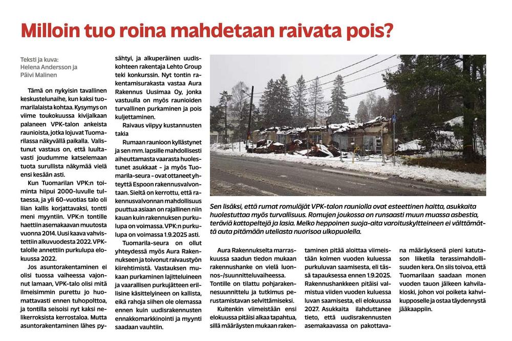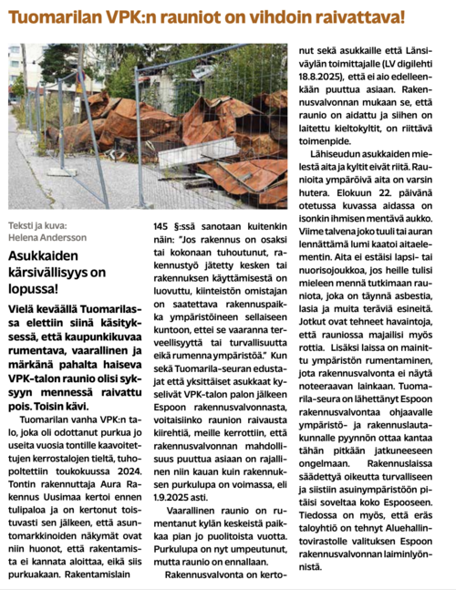 Vaarallinen raunio on rumentanut kylän keskeistä paikkaa jo puolitoista vuotta. Viime kesään asti Espoon rakennusvalvonnasta vastattiin asukkaiden kyselyihin, että rakennusvalvonnan mahdollisuus puuttua raunion raivaamiseen on rajallinen niin kauan kuin rakennuksen purkulupa on voimassa, eli 1.9.2025 asti. Tuomarilassa elettiinkin siinä toivossa, että ruma, vaarallinen ja märkänä pahalta haiseva VPK-talon raunio olisi tähän syksyyn mennessä raivattu pois, tai työ olisi ainakin aloitettu.
