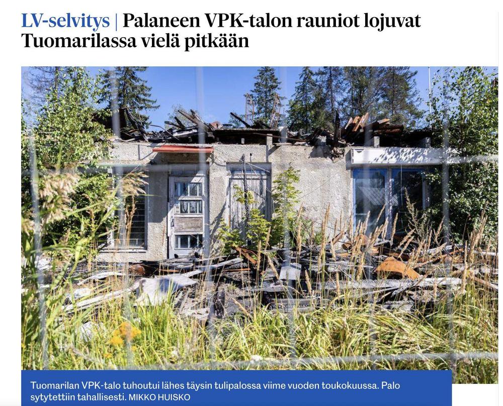 Lintukorvessa tuhopoltettiin hylätty rakennus vain pari viikkoa ennen Tuomarilan VPK-talon paloa keväällä 2024. Ympäristö- ja rakennuslautakunta on jo joulukuussa 2024 velvoittanut uhkasakolla tehostaen p.o. kiinteistön omistajan raivaamaan ja tasoittamaan tontin turvalliseksi edellä mainitun maankäyttö- ja rakennuslain 170 §:n perusteella. Tuomarilassa hyvin samanlainen raunio ei rakennusvalvonnan mielestä edelleenkään aiheuta mitään turvallisuusriskiä tai haittaa kaupunkikuvalle.